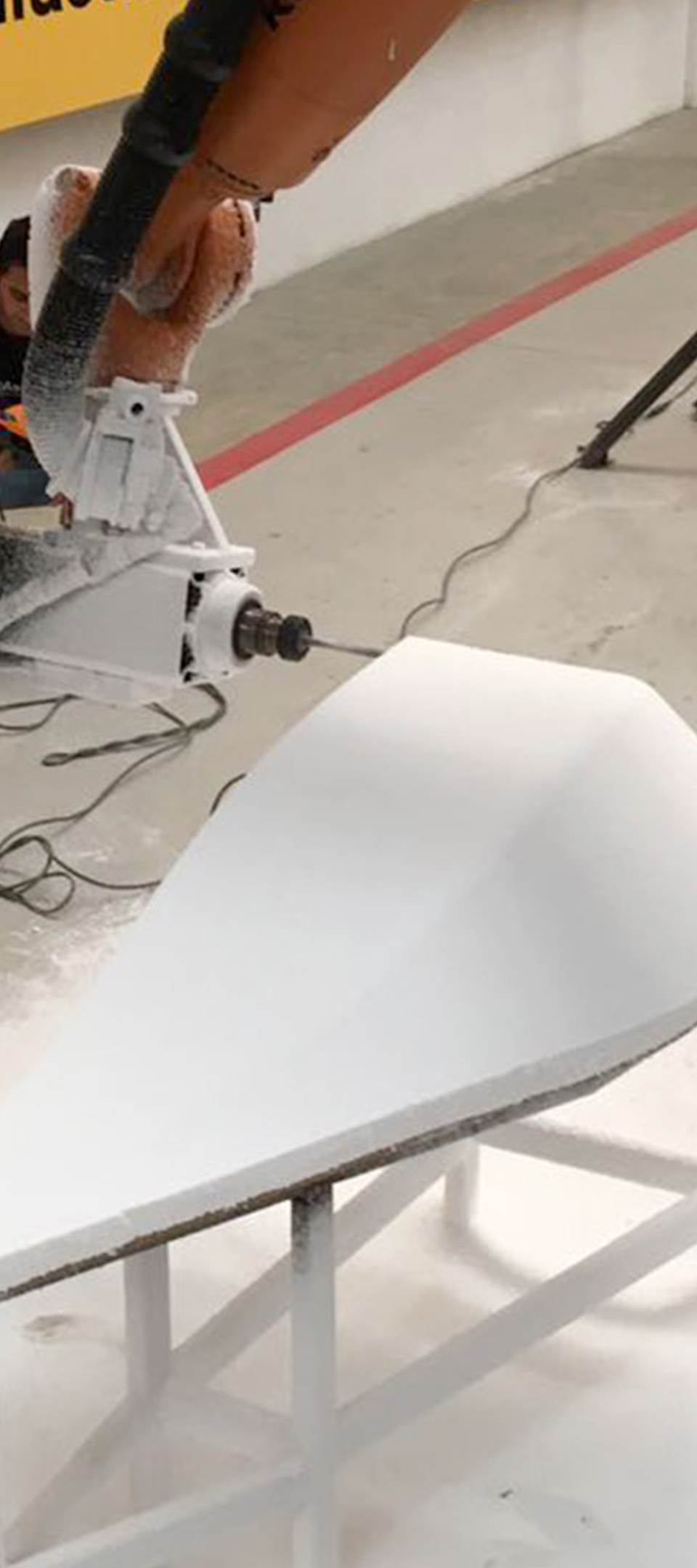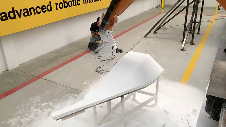Due to the wall's complex geometry, we used a 7 axis KUKA robot for its fabrication with a high precision.