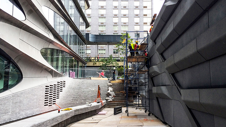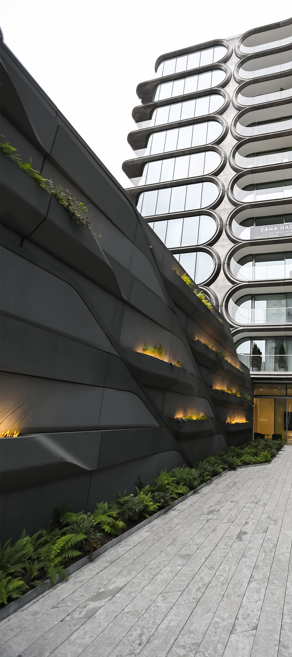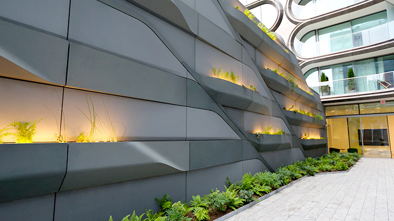 This green wall feature is located on the exterior patio of the 520 West 28th Street residential building designed by Zaha Hadid Architects.