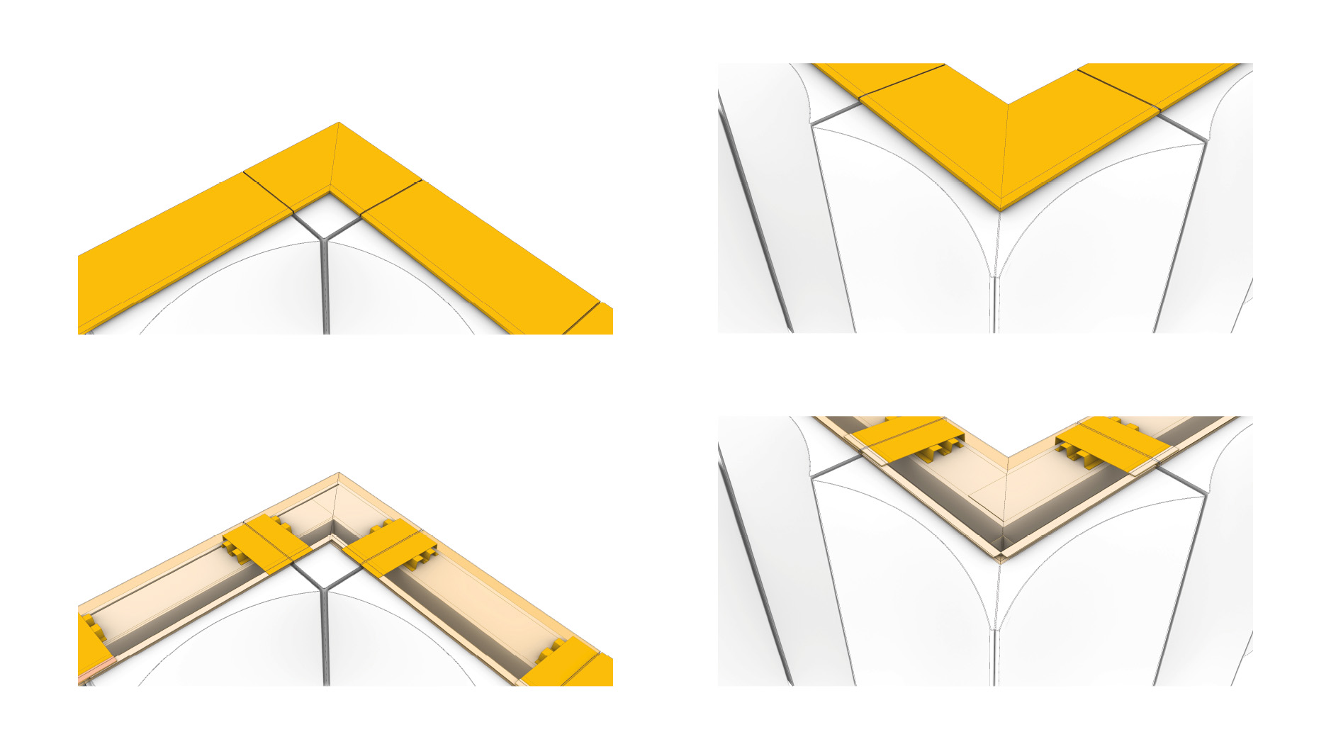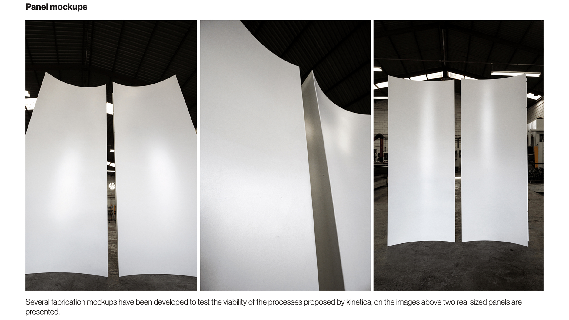 We fabricated the façade rainscreen and louver system with aluminum panels. The façade has a semicylindrical shape that bends at the edges to connect with the next panel, with the largest panel measuring