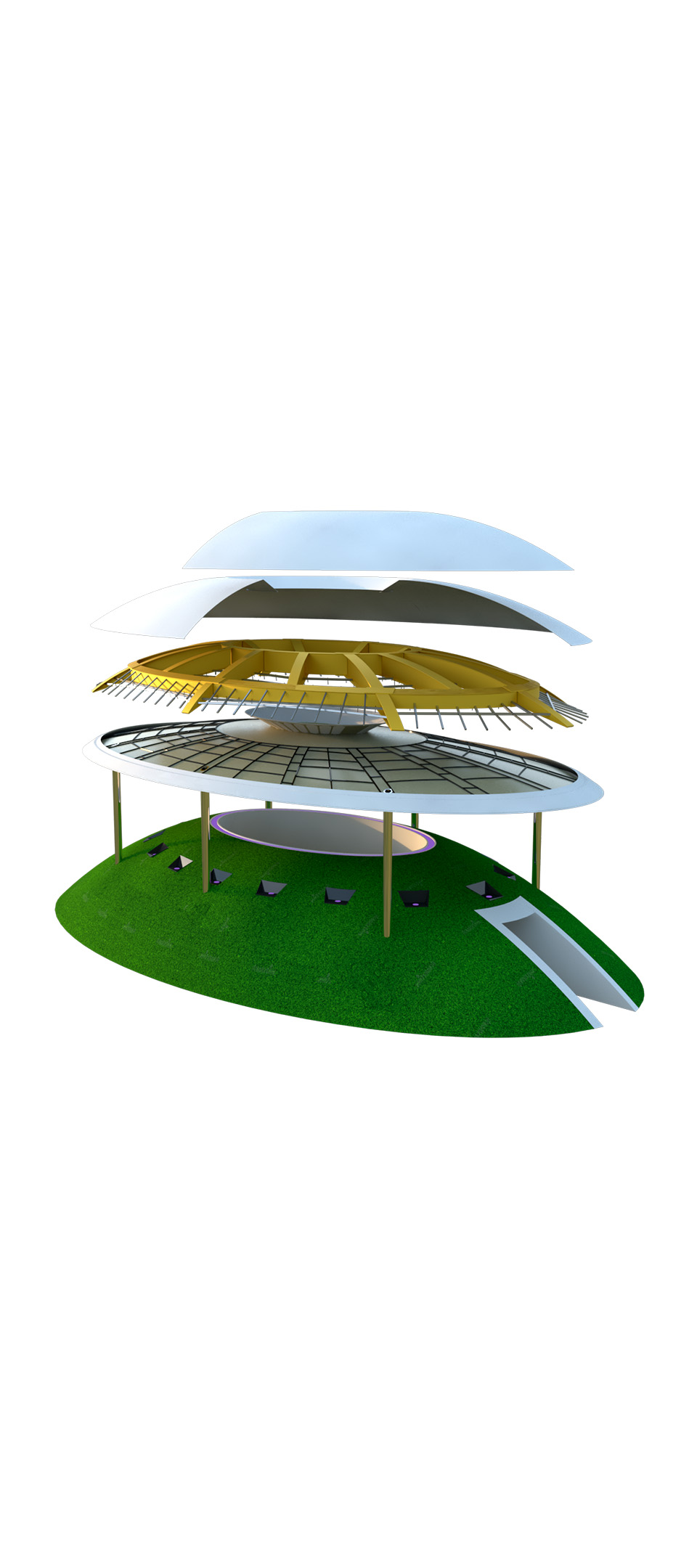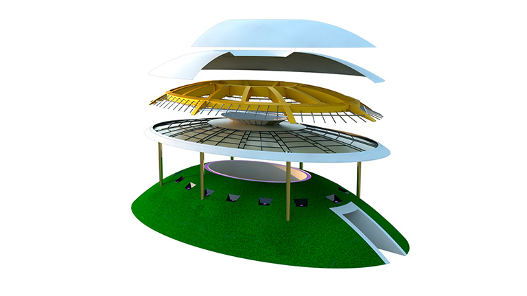 a concave GFRP (glass-fiber reinforced polymer) screen with a central oculus, a 36-metric-ton metallic inner