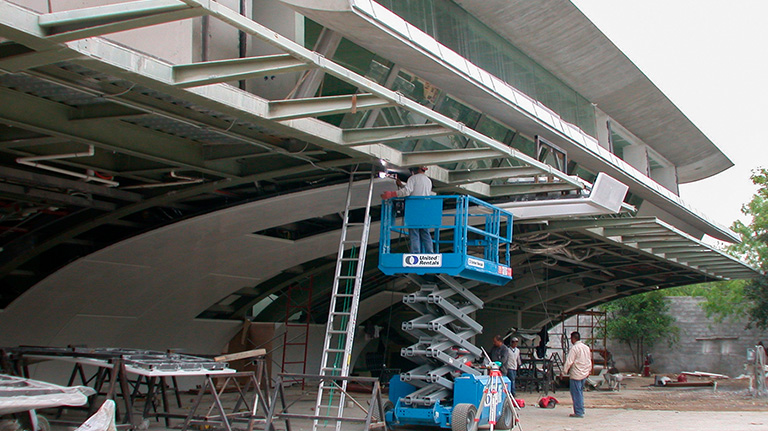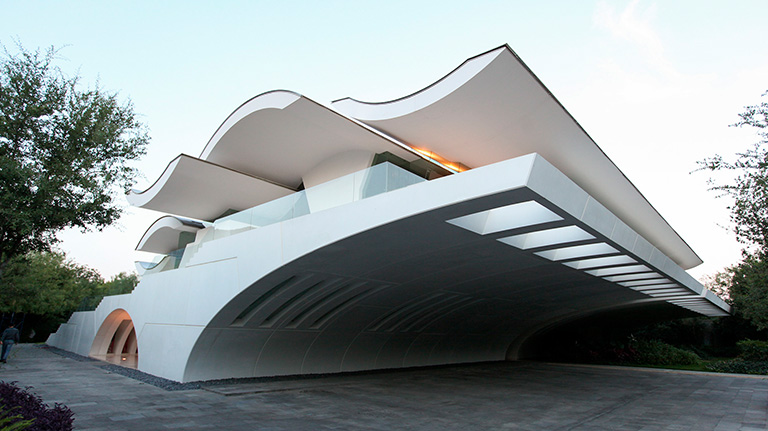 Terrazas is a private residence in Nuevo León, Mexico designed by Wallace E. Cunningham Architects. The residence consists of two independent volumes connected by a custom-made onyx bridge and features wave- like roofs made of stainless steel-covered GRFC (glass fiber reinforced concrete). Kinetica was commissioned to fabricate the roofs, onyx bridge, and reflective white façade for the residence.