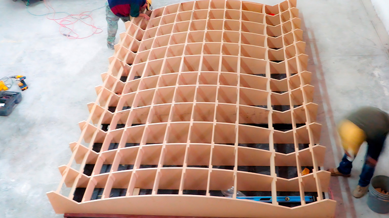 The original design proposal was using white marble for the façade panels. But due performance, lightweight requirements, and malleable properties, we suggested using GFRC. We fabricated extra-large molds for the façade panels, some of these featured up to 8 visible faces. In order to get seamless faces, we designed glass fiber reinforced plastic (FRP) molds for maximum reusability and meticulously sealing the molds' pores achieving an automotive-like glossy finish. Extensive calibration and study of the GFRC mixture with white concrete ensured color preservation and minimized maintenance requirements even when exposed to outdoor conditions.